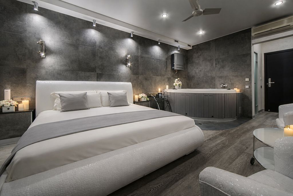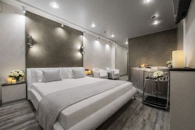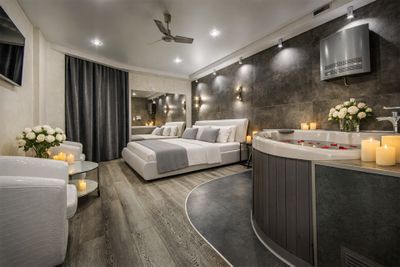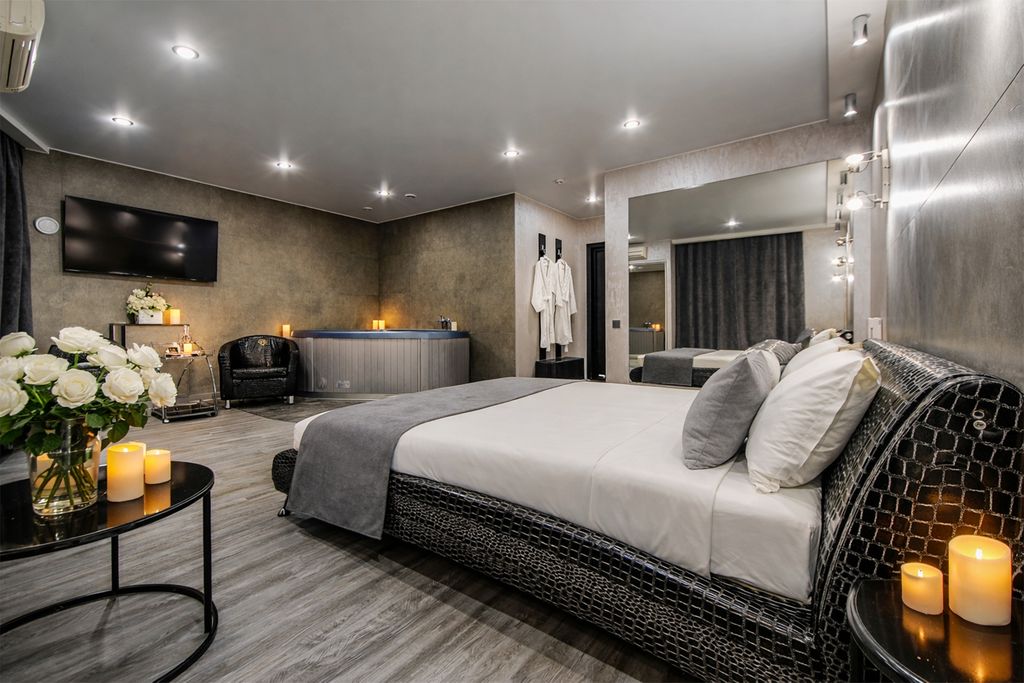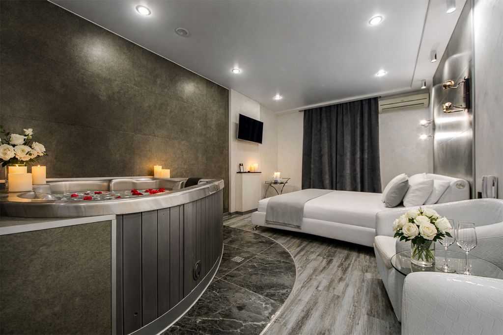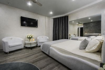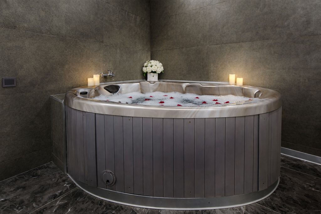 Джакузи, собственно ради него и снимали номер Относительно чисто В наличии тапочки одноразовые, халаты, полотенца, набор для гигиены (два набора зубных щёток с пастой, по 4 саше с гелем для душа и шампунем) Большая кровать, удобная Современная мебель, в том числе в ванной