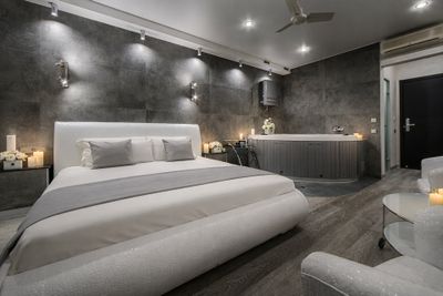 Во первых, санузел. Он совмещённый, и душ перегороджен только одной стеклянной перегородкой в половину стены. Всё брызги летят на стены, на пол, как бы вы не старались. Итог- мокрый пол рядом с раковиной и унитазом. Слив работает не очень, что в раковине, что в душевой, вода ещё долго стоит. Нет крючков для полотенец рядом с джакузи, либо рядом что-то ставить, чтобы до полотенца дотянуться, либо вешать на джакузи, что не очень удобно. Нет ни стола, ни барной стойки, ничего либо такого. Только маленький столик с двумя креслами. Кушать либо на кровати, либо за этим низким столиком. Даже если дошик заходите заварить, или чай сделать, просто негде. Чайника или микроволновки тоже нет. Холодильника тоже. То есть либо приносишь готовую еду и съедаешь сразу, чтобы не испортилось, либо заказываешь доставку, и так же съедаешь сразу. Первый раз видим номер, где нет нормальных условий для питания. В номере было достаточно сколов на стенах, дырок в потолке, паутина в углах. То есть деньги в случае порчи мебели списываются, но куда они идут непонятно, хоть это и не критично. Подушки-медузки, спать на них не комфортно