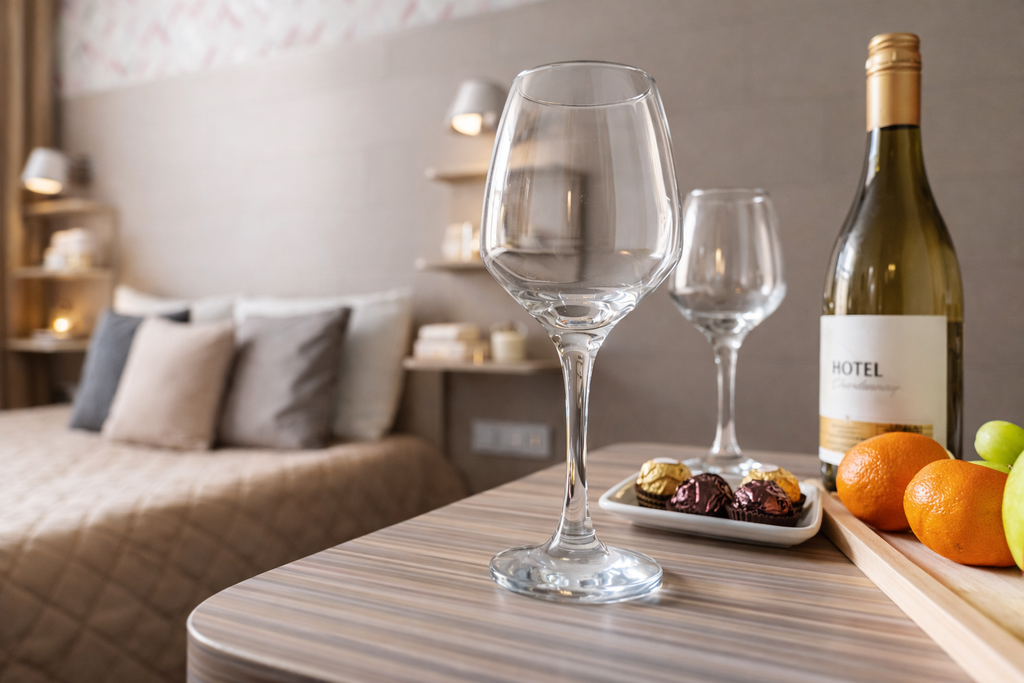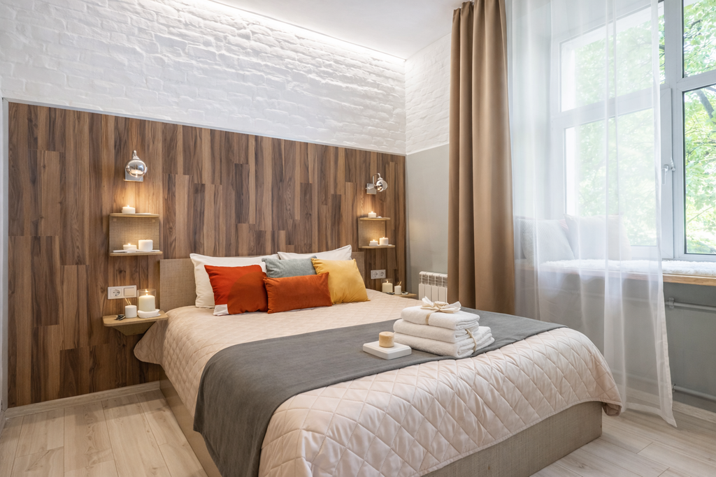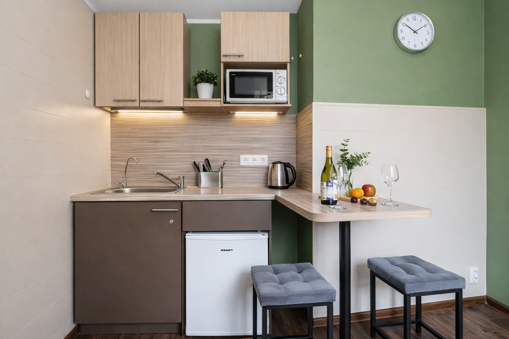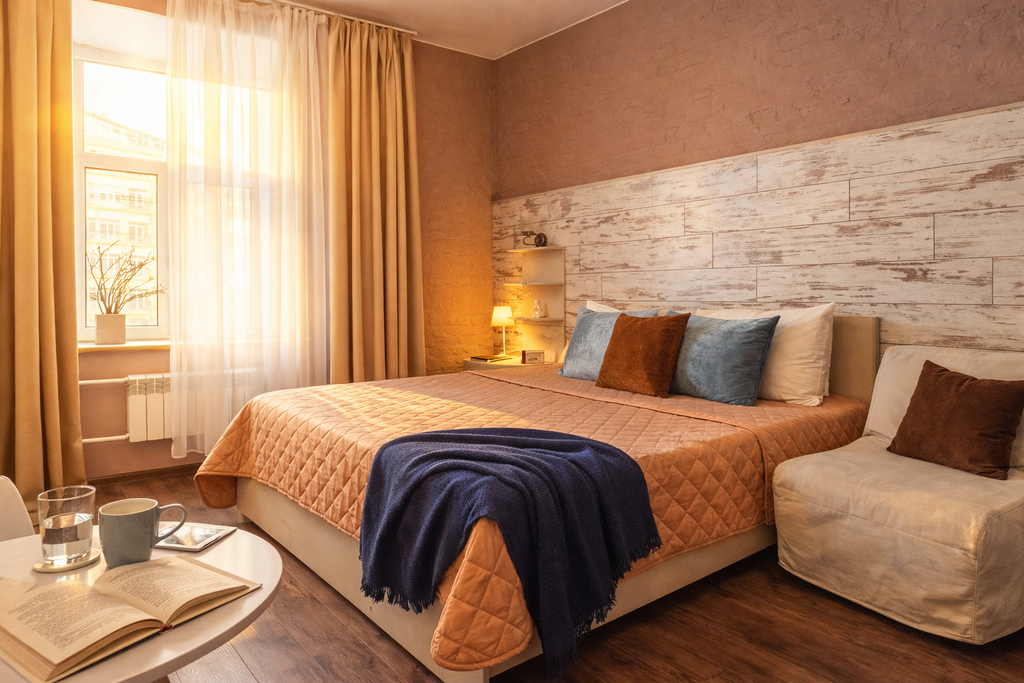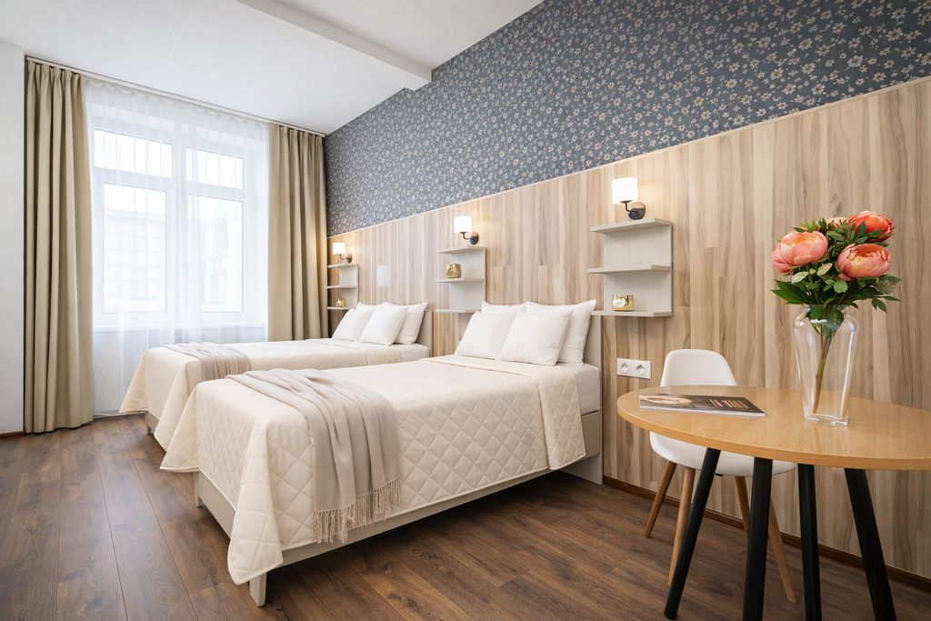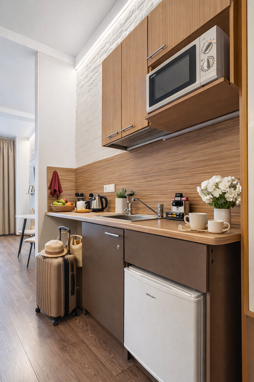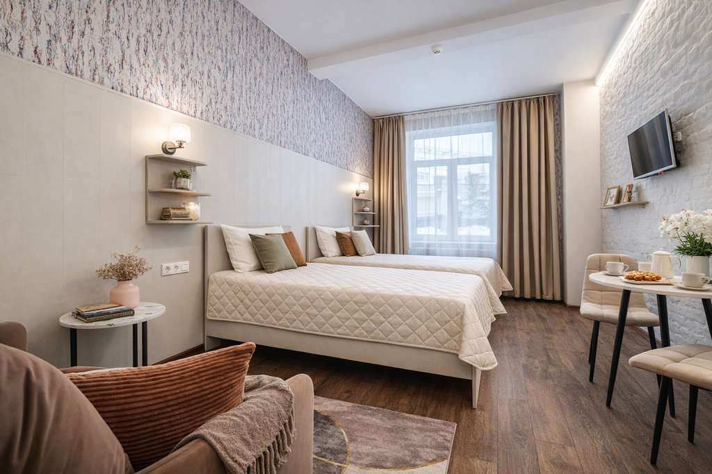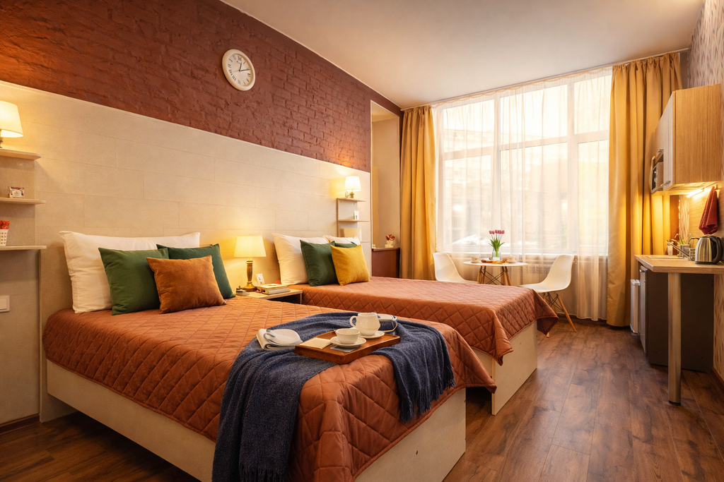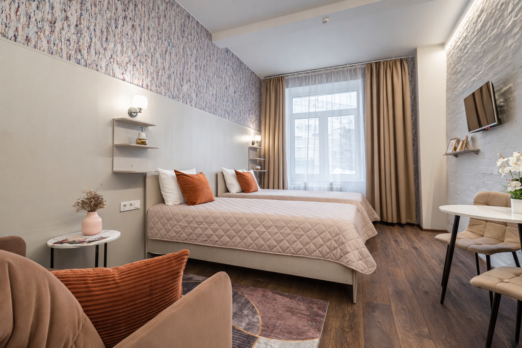 Номера с одно- и двуспальными широкими кроватями, большие просторные окна, высокие потолки. Студии уютно обставлены и